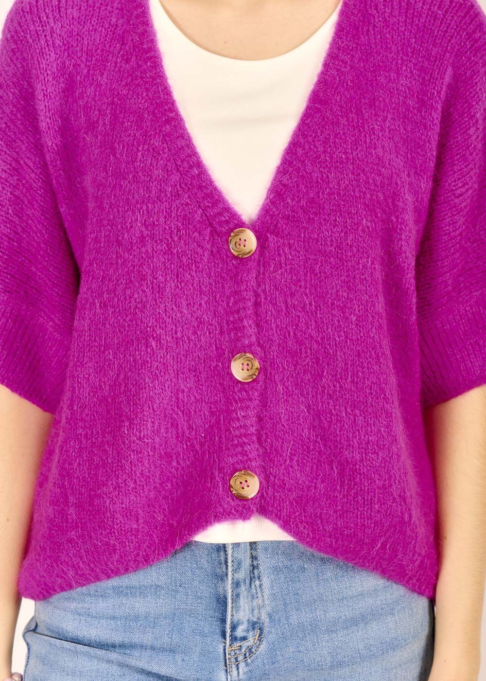 Dieser lässige Strick-Cardigan in leuchtendem Fuchsia zieht garantiert alle Blicke auf sich. Ein selbstbewusstes Lieblingsstück für alle, die Farbe lieben und Lust auf den Frühling haben. Bis die Temperaturen wieder steigen, hält dich das weiche Strickmaterial angenehm warm.