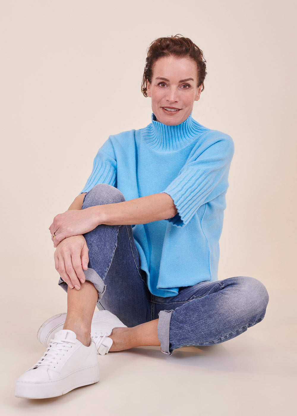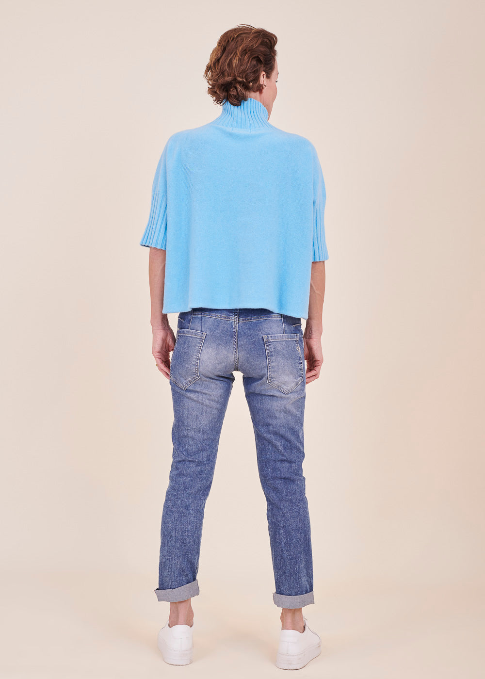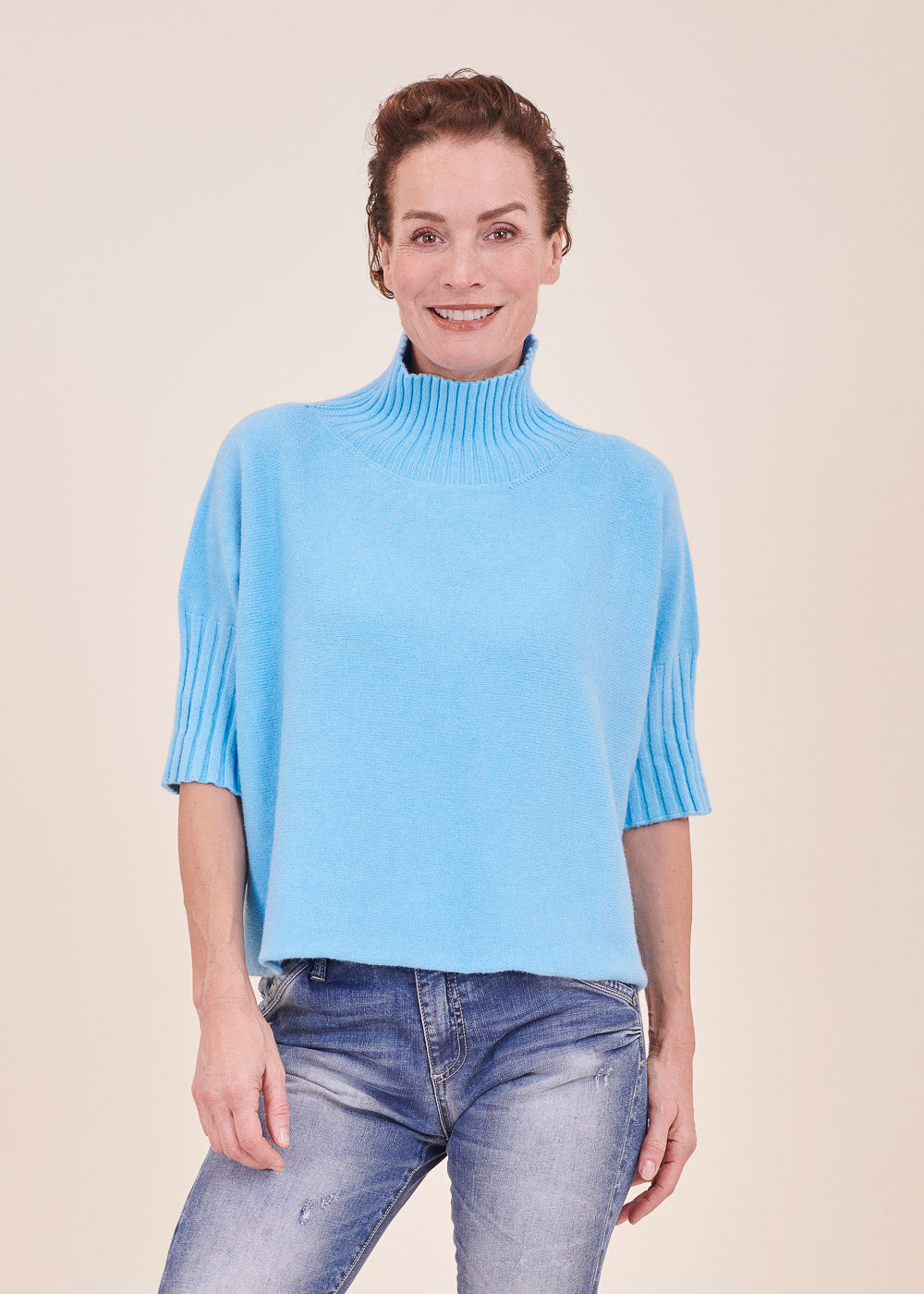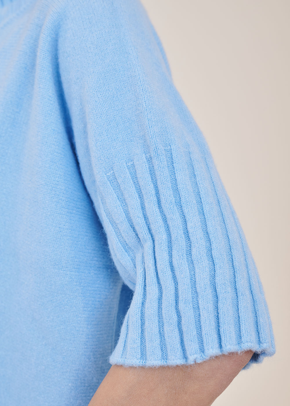 Kurz geschnittener Strickpullover mit Rollkragen aus unserem Kuschelgarn. Er hat ein Rippenbündchen am Kragen und an den Ärmeln. Mit kurz geschnittenen Armen.