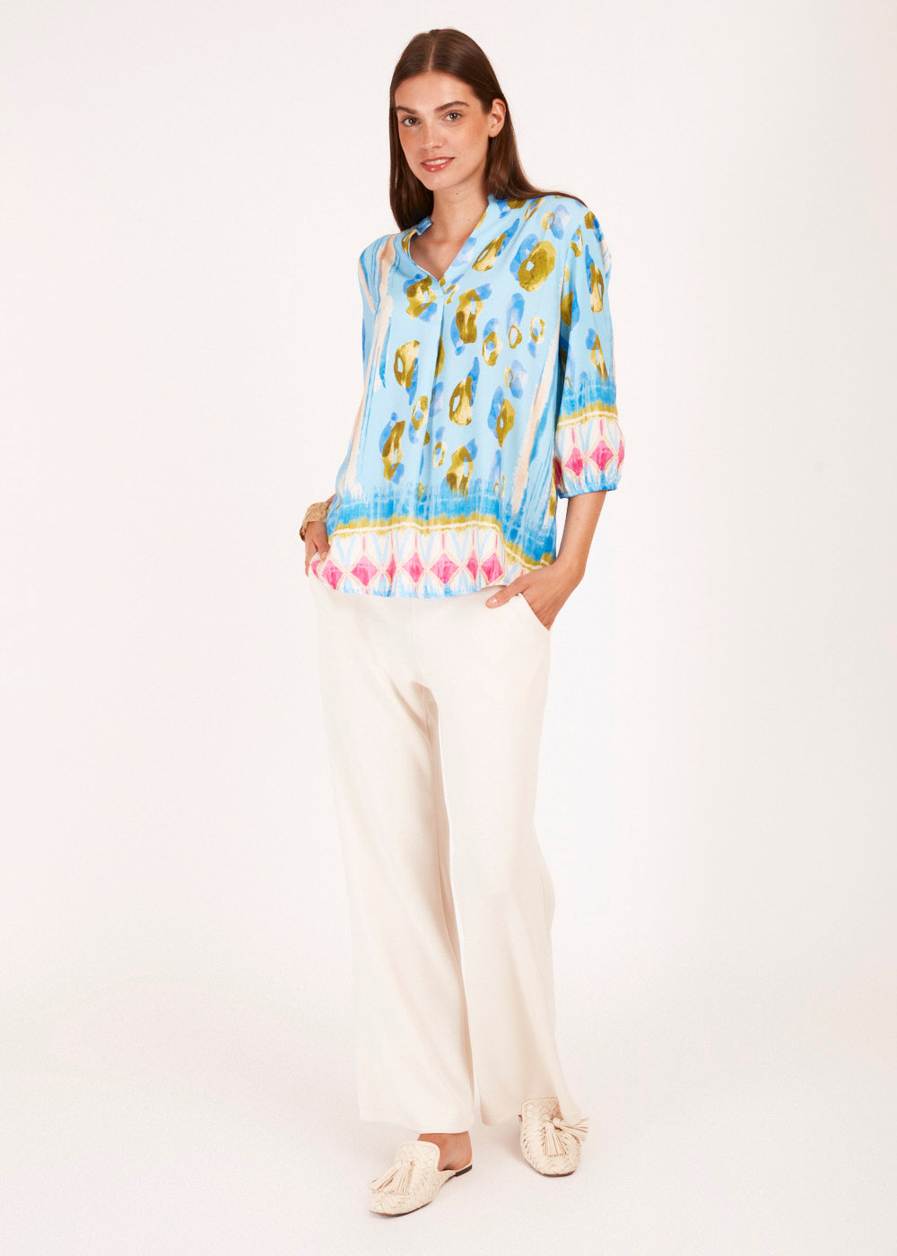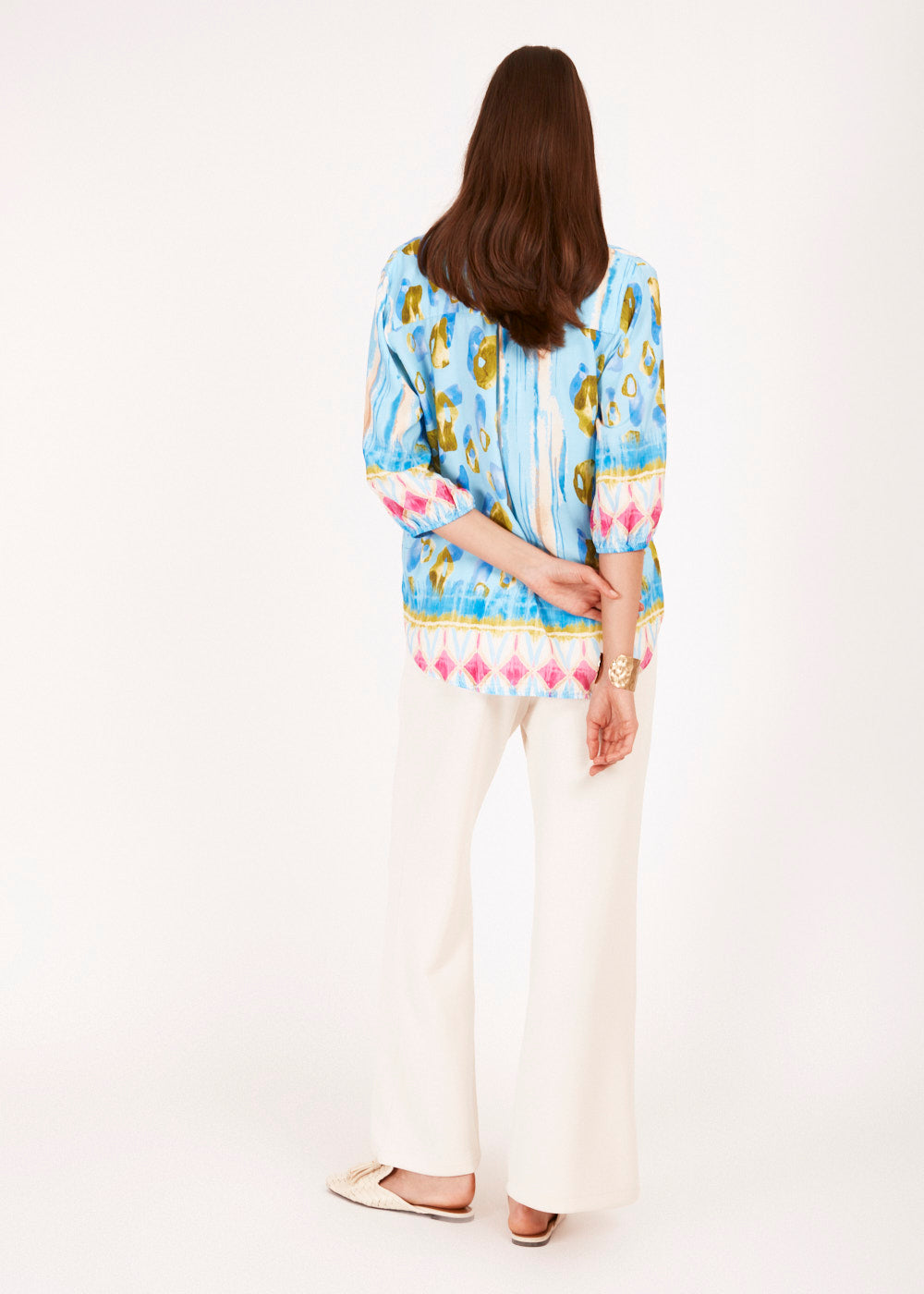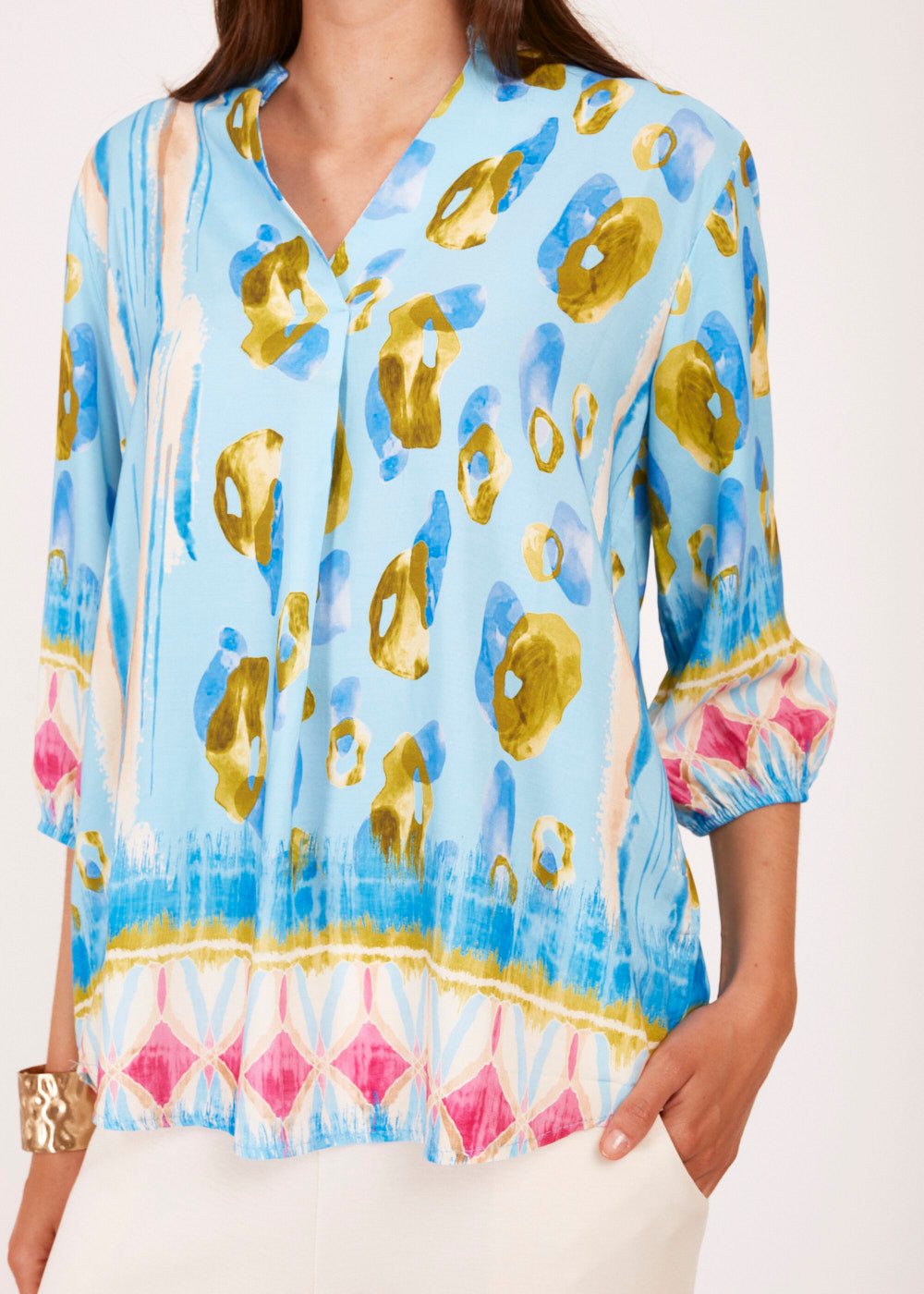 Diese stilvolle 3/4 Arm Druckbluse vereint Komfort und Eleganz, mit ihrem einzigartigen Muster und der schmeichelhaften Passform perfekt für jeden Anlass.