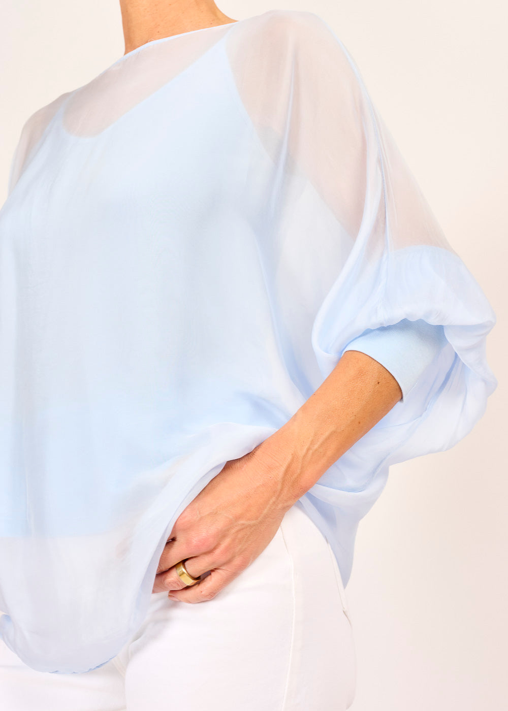 Dieses 2in1 Blusenshirt in der Farbe Celeste kombiniert ein schlichtes Tanktop mit einem transparenten, langärmligen Oberteil für einen spannenden Layering-Look. Elegant und gleichzeitig provokativ – ein stylisches Statement für modebewusste Auftritte.