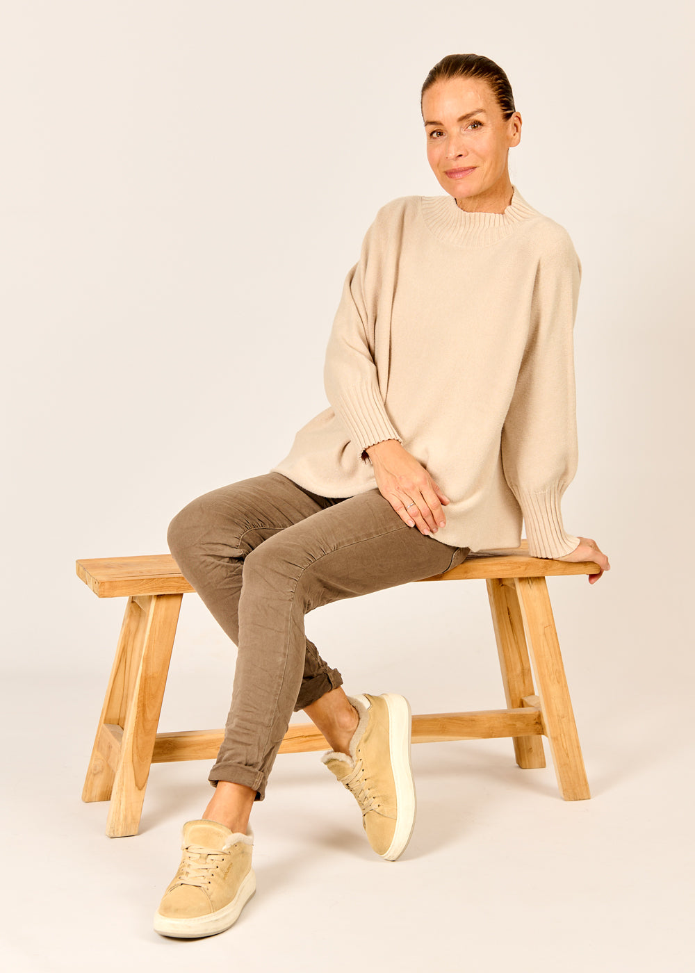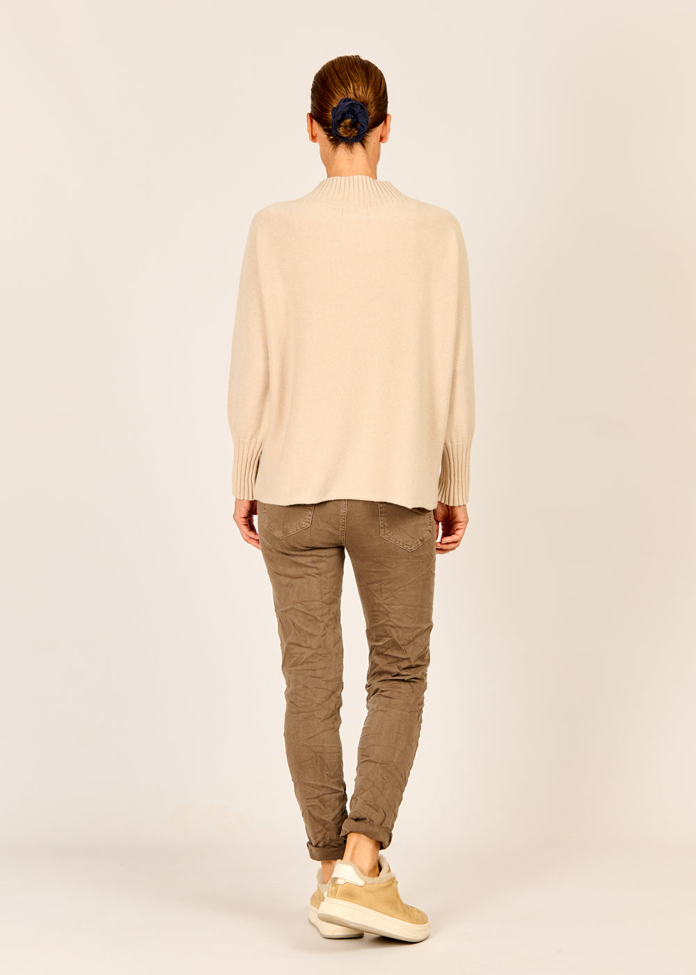 Dieser edle Pullover in strahlendem Avorio (Elfenbein) ist das zeitlose Basic, das in keiner Wintergarderobe fehlen darf. Der dezente Stehkragen mit breiter Rippstruktur verleiht dem kuscheligen Strick einen Hauch von Eleganz und bietet gleichzeitig wohlige Wärme. Sein lockerer, unkomplizierter Schnitt macht ihn zum perfekten Kombinationspartner für alles – von schmalen Hosen bis zu fließenden Röcken.